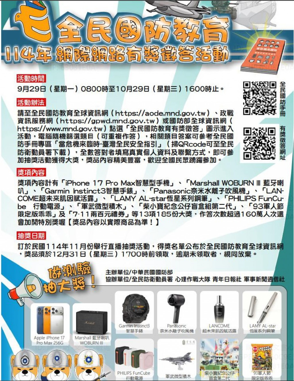 國防部114年全民國防教育「網際網路有獎徵答活動」