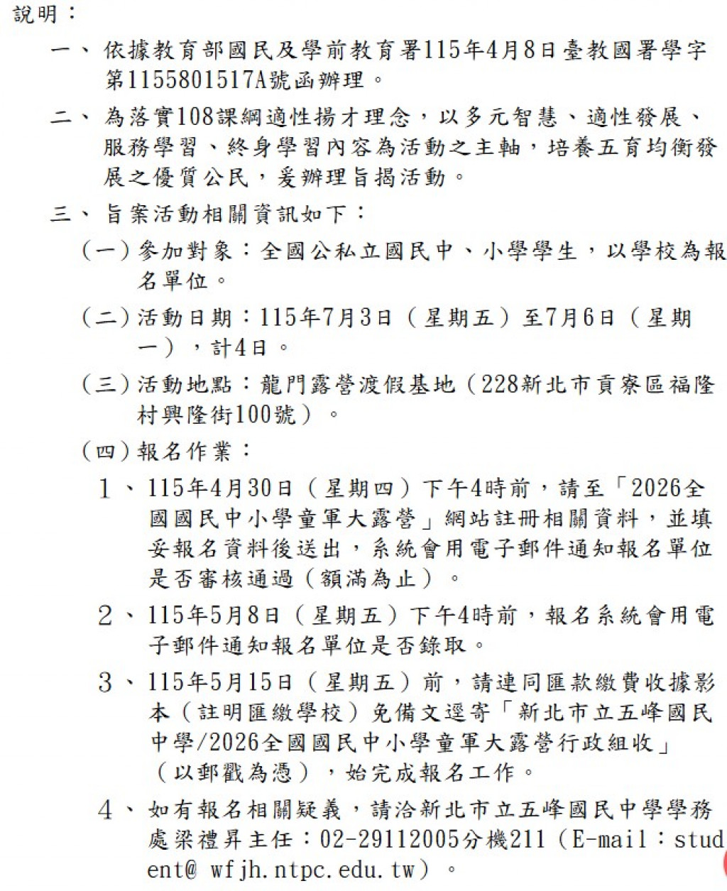 轉知:新北市政府教育局辦理「2026全國國民中小學童軍大露營」活動